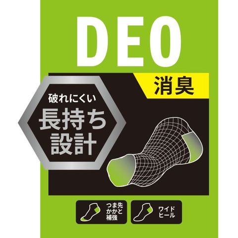 シンプルなロゴのワンポイントが使いやすい一足です。嬉しい消臭機能付きで気になるニオイを軽減してくれます。つま先かかと補強で破れにくく、ワイドヒールがかかとを包み込んでくれるので快適な履き心地です。