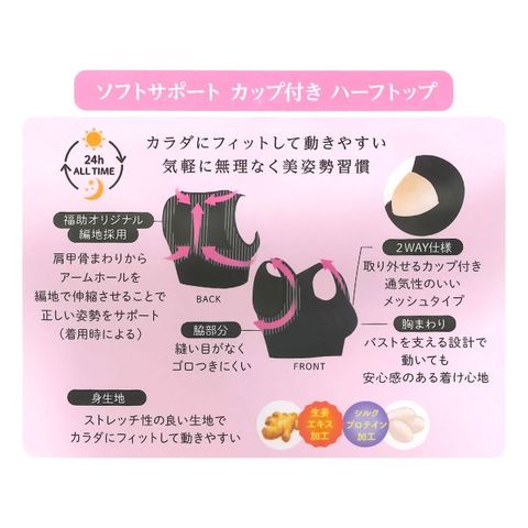 美温活シリーズより美姿勢サポートインナーのハーフトップです。肩甲骨まわりは福助オリジナルの編地で正しい姿勢をサポートしてくれます。取り外せる通気性の良いメッシュタイプのカップ、ケアネームは転写プリントでゴロつきにくいのもおすすめです。