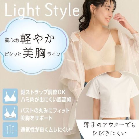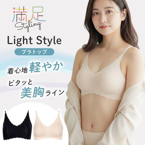 Styling満足よりブラトップの登場です。ノンワイヤーで軽やかな着け心地、締め付けにくいのに、胸をしっかりホールドしてくれる立体設計になっています。薄地で通気性がよく、シームレスで薄手のアウターでも響きにくい仕上がりになっています。脇高幅でハミ肉が出にくく、肩紐の長さを調整できるのも嬉しいポイントです。