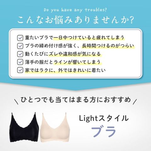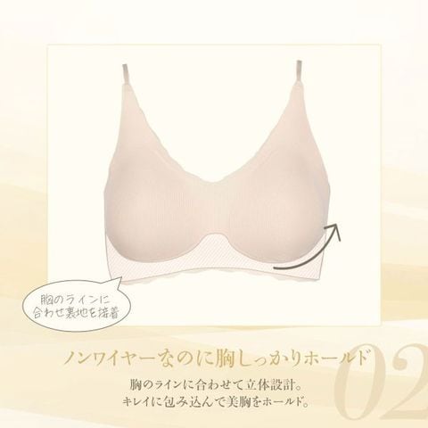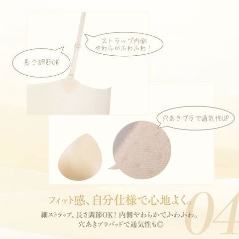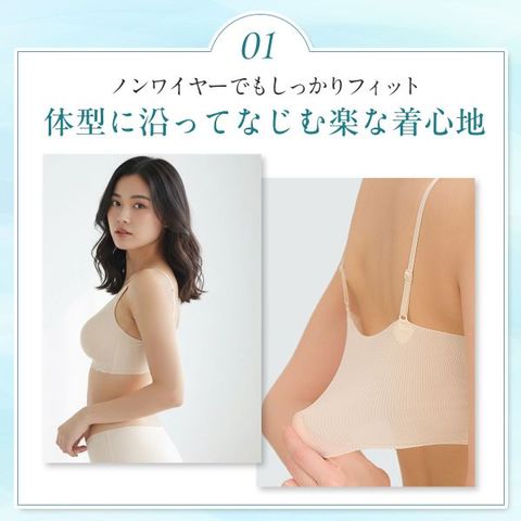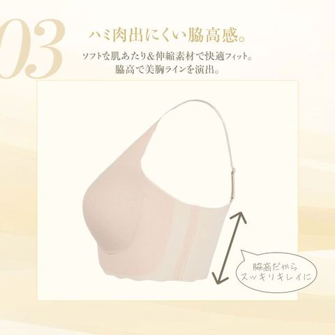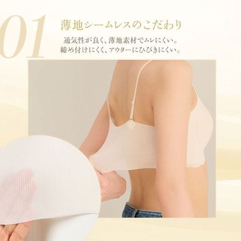 | 仕 様 | ・パッド:あり ・パッドポケット:あり ・ワイヤーなし ・肩紐取外:可 ・肩紐調整:不可 ・ストレッチ素材 ・シームレス設計 |