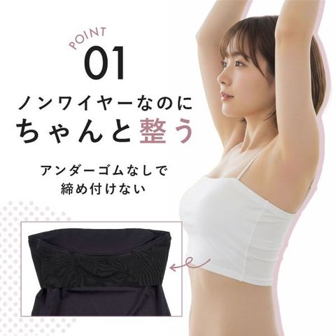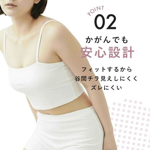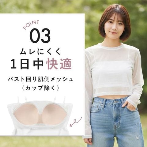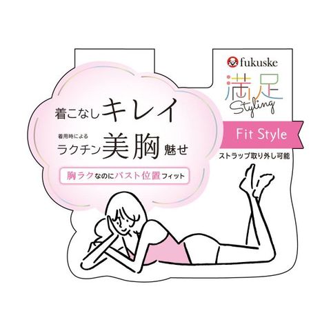 「満足スタイリング Fit Style」は、締め付けにくさとお洒落美胸を両立させた、高機能なカップ付きブラトップです。このブラトップはノンワイヤーでありながら、バストをほどよく整える左右一体型カップを使用することで、胸を優しくキレイに包みます。前かがみの姿勢でも谷間チラ見えしにくいフロント設計で安心感があります。脇部分はハミ肉がでにくい脇高設計となっており、サイドから背中にかけて背中スッキリラインを演出し、キレイ魅せを叶えます。着心地の快適さにもこだわり、カップのアンダー部分がゴム無しのフリーカットタイプなので締め付けにくく、段差が出にくいのでスッキリとした着用感が特徴です。カップを除くバスト周りの肌側はメッシュ仕様で通気性が高くムレにくく、伸縮性の高い素材を採用しているのでストラップレスで着用してもズレにくいフィット感が特徴です。華奢な細ストラップは、アジャスターで長さ調整OK、取り外しもOK、バッククロスも可能な3WAY仕様なので、アウターに合わせて自由な着こなしが楽しめます。光沢感ある見た目と心地よくフィットするストレッチ性のある肌触り滑らかな素材は、抗菌防臭加工が付いています。