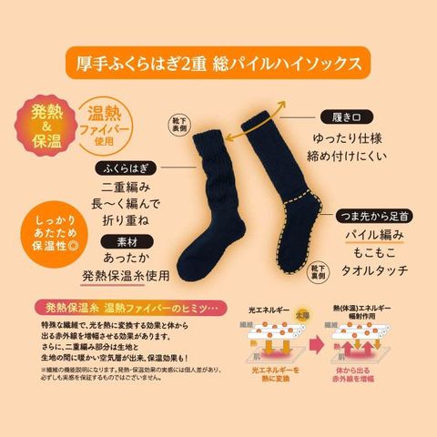 | 仕 様 | ・発熱保温糸使用 ・ふくらはぎ二重 ・つま先~足首パイル |
