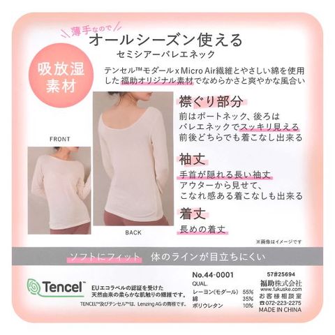 薄い!軽い!サラっと柔らかい!オールシーズン着用できるシアーインナーの登場です。福助オリジナルのなめらかな綿混素材を使用し、「上品な透け感」と「なめらかな肌触り」を実現しました。季節・気温に左右されない素材で、長く愛用できる万能アイテムです。肌着なのに見えてもお洒落なカラーとデザインなので、便利にファッションに取り入れられます。