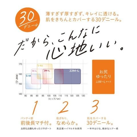 柔らかくふんわりとしたはき心地で、キレイに透ける年間定番の30デニールシアータイツ。