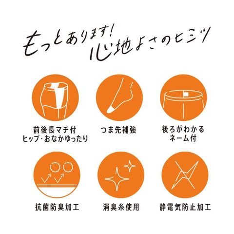 消臭ポリウレタンにハイマルチなナイロンを組み合わせることで、ふんわりとした柔らかさを演出しながら、気になるにおいなどもケアします。さらにパンティ部にもレッグと同じ糸を使用することでお腹周りもふんわりとした肌ざわりです。