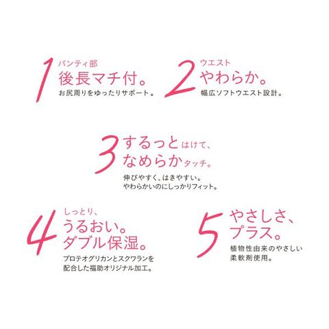 幅広のソフトウエストでお腹がゆったりと過ごせるアイテムです。消臭ポリウレタンが気になるニオイケアをサポート。乾燥しやすい季節にうれしい保湿加工・静電気防止加工も施しており、はき心地もなめらかです。