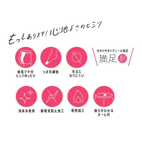 毛玉ができにくく(抗ピル加工)、あたたかい発熱加工を施した80デニールのレギュラータイツ。