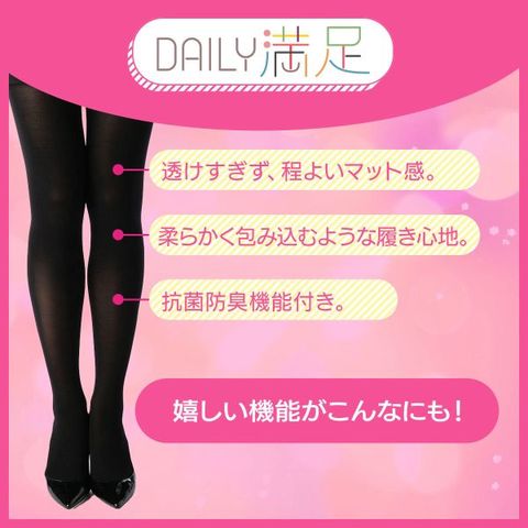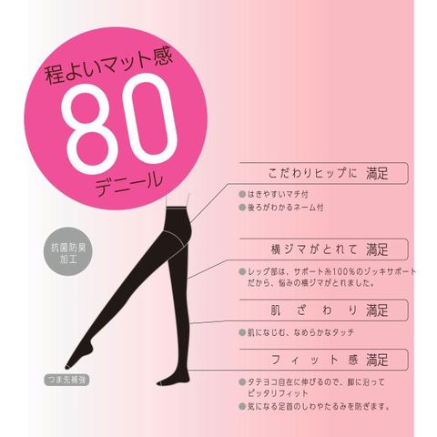 程よい厚みがあるマットな80デニールのタイツ。パンティ部にマチが付いているので、しっかりフィット、ズレを防止します。つま先が補強されているのもうれしいポイント。抗菌防臭加工により気になる臭いやムレのケアにも。