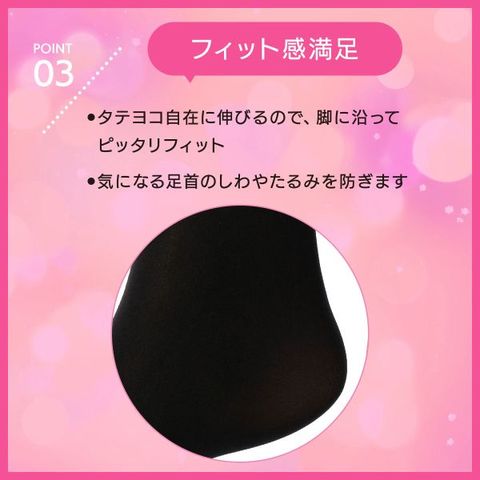 | 仕 様 | ・3足組 ・80デニール ・つま先補強 ・マチ付き ・抗菌防臭加工 |