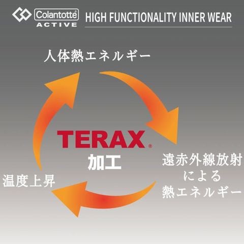 「着る、リラックス」大人気コラントッテ アクティブより、インナーウェアが登場しました。遠赤外線の放射による血行促進が見込めます。背あて部分に数種類の鉱石粉体をブレンドした遠赤外線を放射するTERAX加工を施しました。インナーなので日常生活に取り入れやすく、アウターの下でこっそり血行促進による快適な生活が得られます。