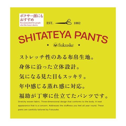 ストレッチ性のある布帛生地、身体に沿った立体設計、気になる見た目もスッキリ。年中感じる蒸れ感に対応。福助が丁寧に仕立てたトランクスです。