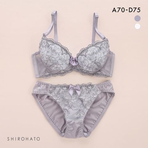 こまやかな線画調ローズ刺繍にキラキラ輝くラメをちりばめた華やかなブラ&ショーツセット。前中心には大きなサテンリボンをあしらい、愛らしく仕上げています。