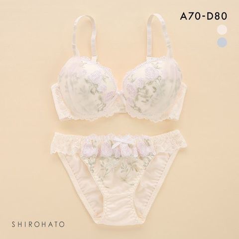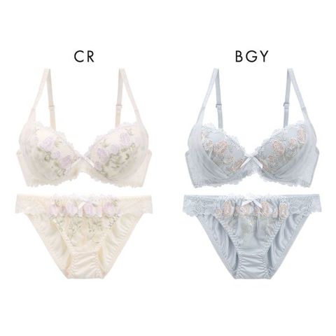 アンティーク調のチューリップ刺繍レースにふんわりサイドベールをかけたブラ&ショーツセット。