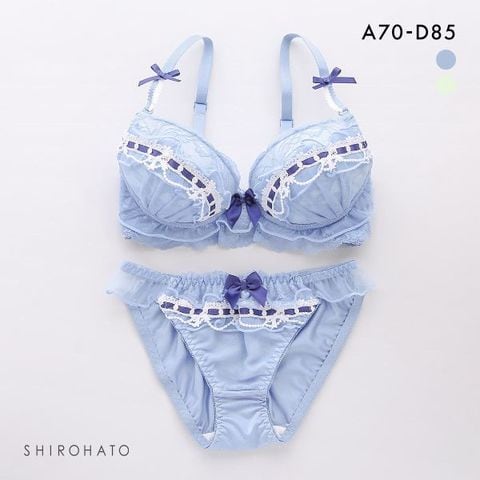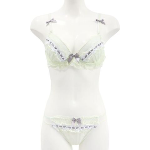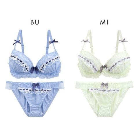 シアーなレースフリルとリボン通しのケミカルレースがラブリーなブラセット。サテンリボンをちりばめ、愛らしく仕上げています。