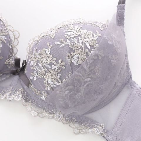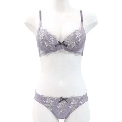 ノンワイヤーの快適さと谷間メイクを両立したブラ&ショーツセット。ふんわりシアーなチュールベールとボタニカル刺繍レースが上品でオトナなデザインです。