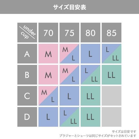 | 仕 様 | ブラ ・ホックの数:2段3列 ・3/4カップ ・下厚内蔵パッドあり、パッドポケットなし ・肩紐取外し:不可 ・肩紐調節:可 ・ワイヤーなし ・サイドボーン:あり ショーツ ・伸縮性:バックのみ縦横にあり ・透感:なし ・クロッチ:あり |
