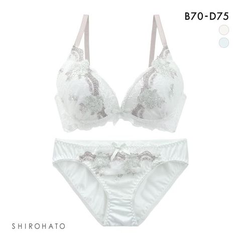 ストレッチレースのカップに、繊細なフラワーアーチ刺繍レースをサイドリフト風に重ねた華やかなブラ&ショーツセット。前中心には大きなサテンリボンをあしらい、愛らしく仕上げています。