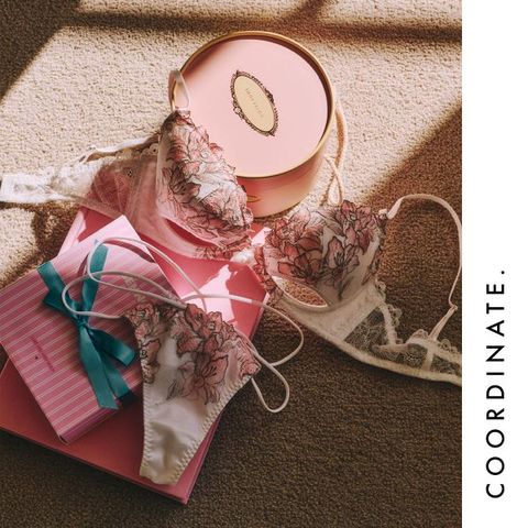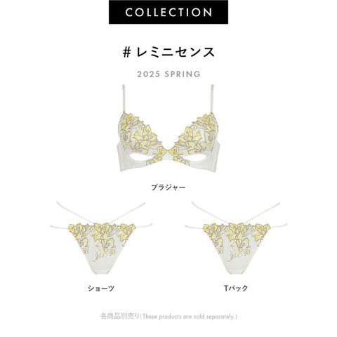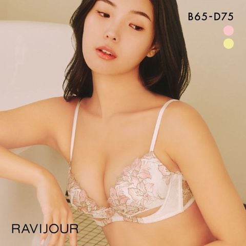 ストロメリアの花を春らしいカラーリングで描いたエンブロイダリーレースとバスト下を大胆に開いたホールデザインがポイント。ホールを空けてもしっかりバストをキープできるようオリジナルパッドで谷間をホールドします。