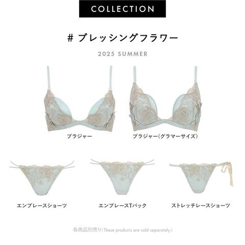 気品あふれるバラ『ゴールデンセレブレーション』の花をイメージしてレースに落とし込んだコレクション。繊細な透け感の刺繍が、大輪の美しさを軽やかに際立たせます。