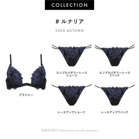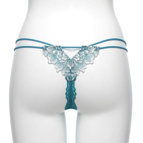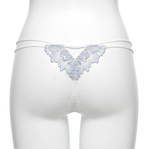 バックスタイルは華やかなエンブロイダリーレースから素肌がほんのりと透け、艶やかな色気を感じさせるTバックショーツ。全面を彩る花びらの立体感と、繊細にきらめくラメが圧倒的な存在感を演出します。サイドのダブルストリングコードが印象的なデザインです。