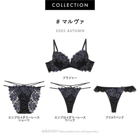 肌に咲き誇るマロウの花を描いたエンブロイダリーレースと、透けて見えるサテンの光沢。落ち着いた色彩が、可憐さと艶やかさを静かに奏でるコレクションです。チュールの上に淡く色づいた花々は、まるで舞っているかのような立体感。サテンとのコントラストにより、マロウの花がくっきりと浮かび上がるデザインです。