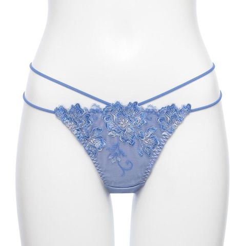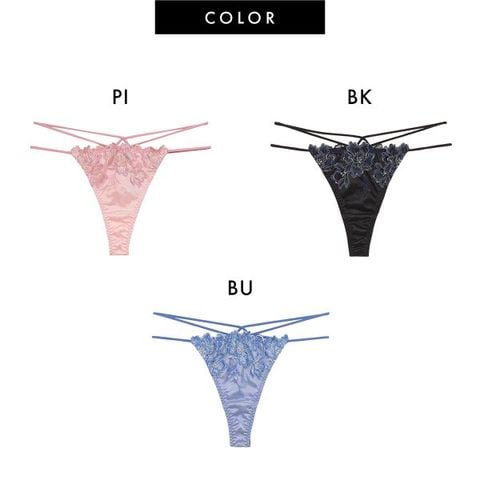 サイドはストリングコードのダブル使いが、腰回りをセンシュアルに演出するTバックショーツ。バックは華やかなエンブロイダリーレースを贅沢に使用し、ダブルストリングコードがクロスするセクシーデザイン。