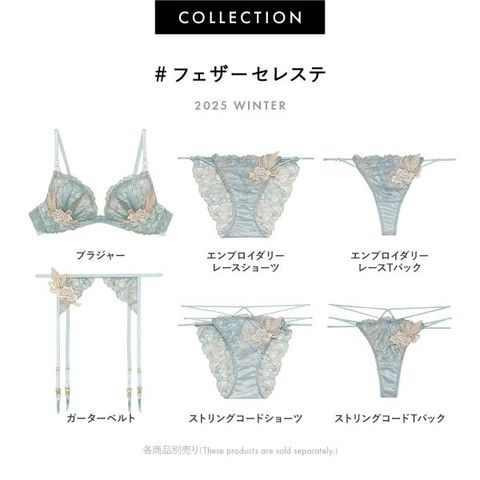 大胆なラメレースが肌に光を散らし、幸福感に満ちたオーラを纏わる。たっぷりのギャザーと贅沢なレースで仕立てたカップは、フェザーラインの陰影が幻想的な立体感を演出。サイドの薔薇と羽のモチーフがロマンティックなアクセントとなり、心まで満たす輝きを宿した、魅惑的なコレクションです。