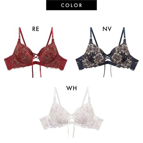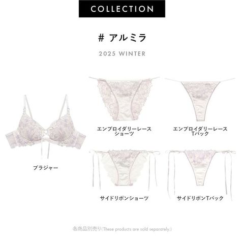 優雅な気品と可憐な艶で魅せるコレクション【アルミラ】。洗練された大人の魅力を引き出します。大輪のフラワーレースに大粒のラメが濡れたように輝き、胸元をドラマティックに演出。センターにはクロスコードとサテンリボンを添えました。サテンリボンは手結びできるので、フィット感を増し、深い谷間をメイクします。