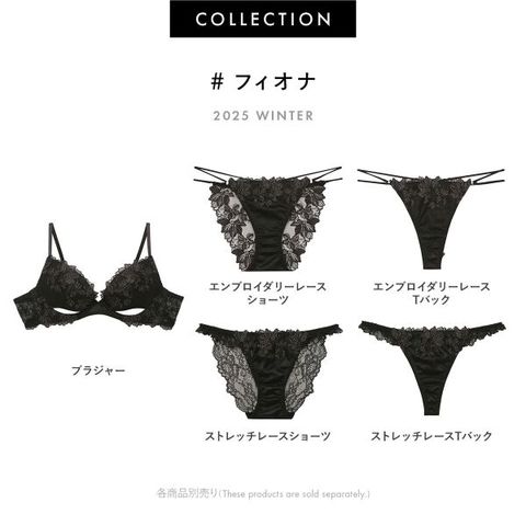 肌の上で贅沢に咲き誇るブラックのエンブロイダリーレースが、端正さと神秘性を同居させるコレクション【フィオナ】。しっとりと輝くサテン素材と、カップ下のホールから覗く素肌が、計算された大胆さと色香を放ちます。 無垢な清らかさと、抗えない艶っぽさが溶け合う、至高のコレクションです。
