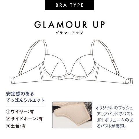 ブラタイプは様々な胸の形に幅広く対応するラヴィジュール定番、デコルテにボリュームを持たせた深い谷間を演出する『グラマーアップ』。