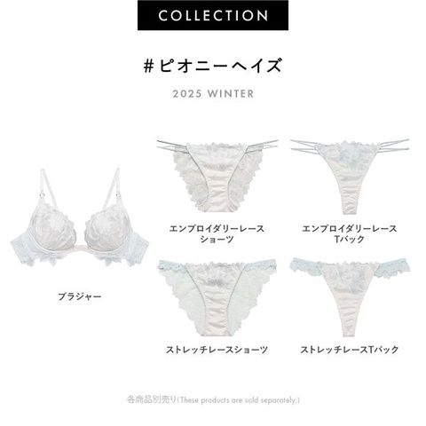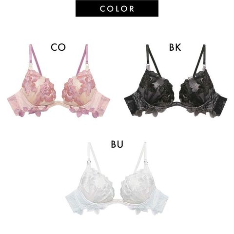 薄霞に浮かぶピオニーをイメージした、幻想的な輝きを放つコレクション。カップ下まで花々が咲き誇る神秘的なデザインと、光を受けて立体的に煌めく花びらの表情が、洗練された大人の気品を演出するデザインです。