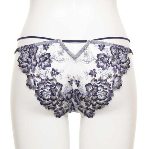 エンブロイダリーレースをバックにも贅沢に使用したノーマルショーツ。サイドはダブルストリングコードがウエストからヒップの曲線を美しく魅せます。バックのV字ホールが、可憐なデザインにセンシュアルなアクセントをプラス。