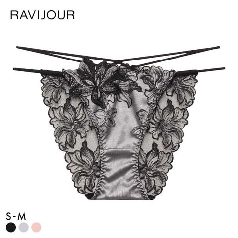 華やかに肌を透かすエンブロイダリーレースをバックに贅沢に使用したノーマルショーツ。サイドのダブルストリングコードがウエストからヒップの曲線を美しく魅せます。