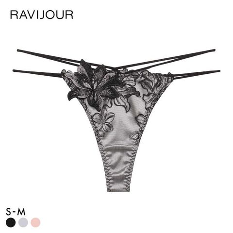 華やかに肌を透かすエンブロイダリーレースをバックに贅沢に使用したTバックショーツ。サイドのダブルストリングコードがウエストからヒップの曲線を美しく魅せます。