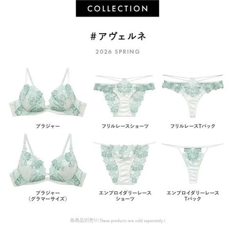 贅沢にエンブロイダリーレースを施したゴージャスなデザイン【アヴェルネ】。ラメのきらめきが美しい羽根のモチーフが、ドラマティックに華を添えます。ウエストラインのコードが色気を放ち、うっとりするような豪華なレースに恋するコレクションです。