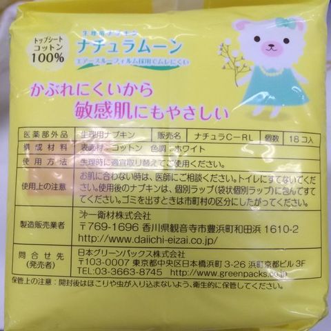 ナチュラムーン Natura Moon 生理用ナプキン 多い日の昼用 羽なし 18個入