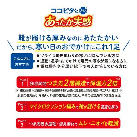 大人気!「脱げないココピタ」のあったか実感レギュラー丈ソックス。独自開発のつま先2層構造で保温力2倍(※)のあたたかさです。