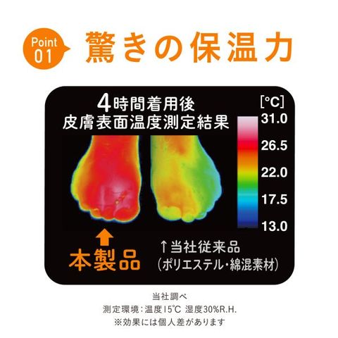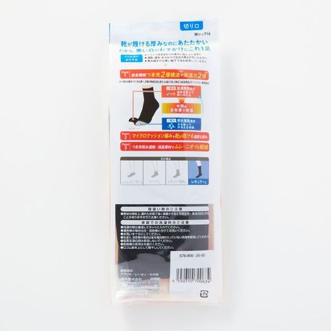 | 仕 様 | ・レギュラー丈 ・吸湿発熱 ・保温 ・吸水速乾(つま先肌側生地) ・消臭(つま先肌側生地) ※生産時期によりパッケージが異なる場合がございます。 生産時期によって組成が【アクリル、ポリエステル、その他】の場合がございますが、お選びいただけません。ご了承ください。 |