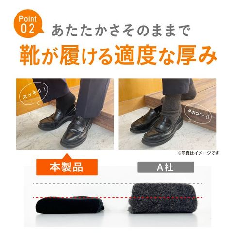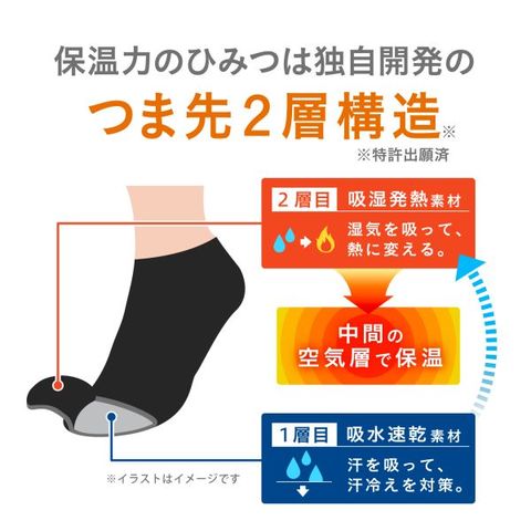 靴が履ける厚みなのにあたたかいから、寒い日のお出かけはこれ1足でOK!肌側の生地が汗を吸い、外側の生地が熱に変え、中間の空気層でつま先を保温します。