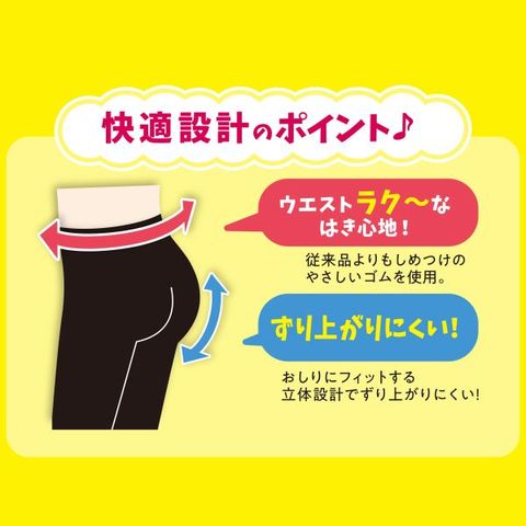 ウエストにはしめつけにくいやさしいゴムを使用し、おなかがラク~♪なはき心地!おしりにフィットする立体設計で、ずり上がりをガードします。