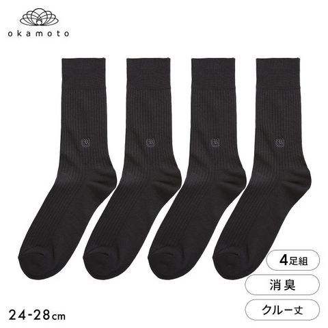 靴下研究所 ニオイ知らず ソックス 4足組 クルー丈 消臭 刺繍 黒 メンズ 靴下 24-26cm 26-28cm オカモト okamoto