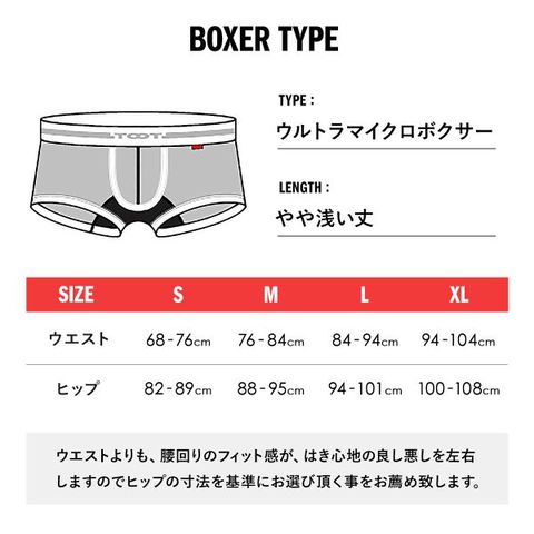 | サイズ | メンズ Sサイズ:ヒップ 82-89cm(ウエスト 68-76cm) Mサイズ:ヒップ 88-95cm(ウエスト 76-84cm) Lサイズ:ヒップ 94-101cm(ウエスト 84-94cm) XLサイズ:ヒップ100-108cm(ウエスト94-104cm) ※ウエストよりも、腰回りのフィット感が、はき心地の良し悪しを左右しますのでヒップの寸法を基準にお選びいただくことをおすすめしております。 |