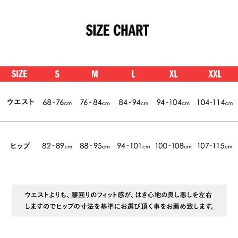 | サイズ | メンズ Sサイズ:ヒップ 82-89cm(ウエスト 68-76cm) Mサイズ:ヒップ 88-95cm(ウエスト 76-84cm) Lサイズ:ヒップ 94-101cm(ウエスト 84-94cm) XLサイズ:ヒップ100-108cm(ウエスト94-104cm) XXLサイズ:ヒップ107-115cm(ウエスト104-114cm) ※ウエストよりも腰回りのフィット感がはき心地の良し悪しを左右しますので、ヒップの寸法を基準にお選びいただくことをおすすめしております。 |