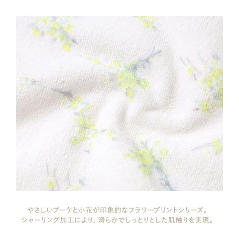 パイルの表面を丁寧にカットしたシャーリング加工により、滑らかでしっとりとした肌触りを実現。プリントの美しさがより際立つ仕上がりです。縁に施したトリミングレースがかわいらしく、フェミニンなアクセントに。