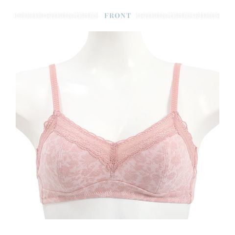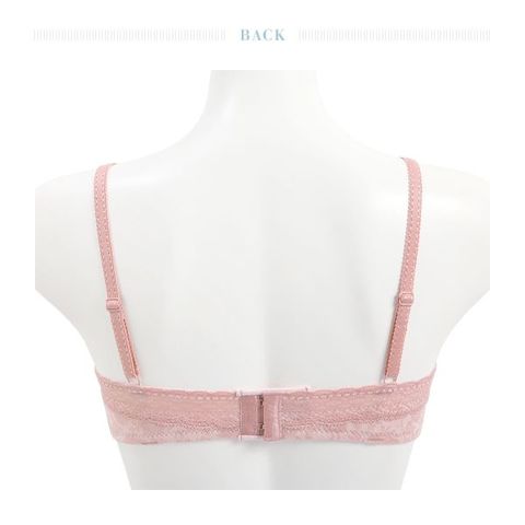 後ろフック仕様のノンワイヤーブラジャー。カップ上部から背中まで広がる幅広レースが優しい雰囲気を演出します。肌に当たるフックアイは特許仕様(綿ベア天くるみ)を採用。カップ裏には綿天竺、アンダー裏には綿ベア天を使用し、肌への優しさを追求しました。