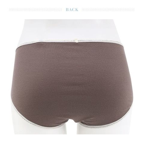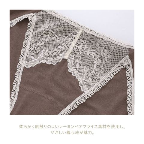 フロントに幅広レースを重ねたデザイン。伸びの良い素材がヒップに心地よくフィットし、広い脚口で動きやすい快適なインナーです。