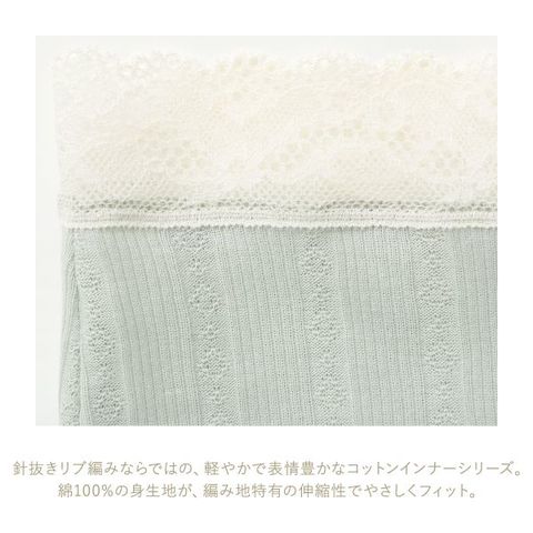 針抜きリブ編みならではの、軽やかで表情豊かなコットンインナーシリーズ。綿100%の身生地が、編み地特有の伸縮性で身体の動きにやさしくフィットします。