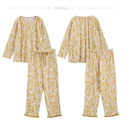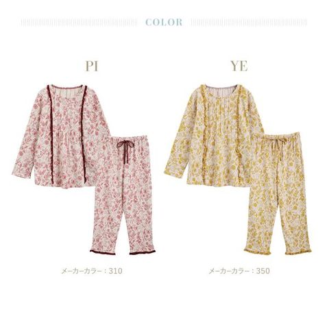 ピンタックやフリルで大人のかわいらしさをプラスした長袖パジャマ。立体的なデザインで顔映りも明るく見せます。後ろ襟はゴム入りで着脱が簡単。パンツはウエストゴムと紐付きで快適です。