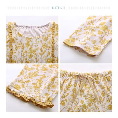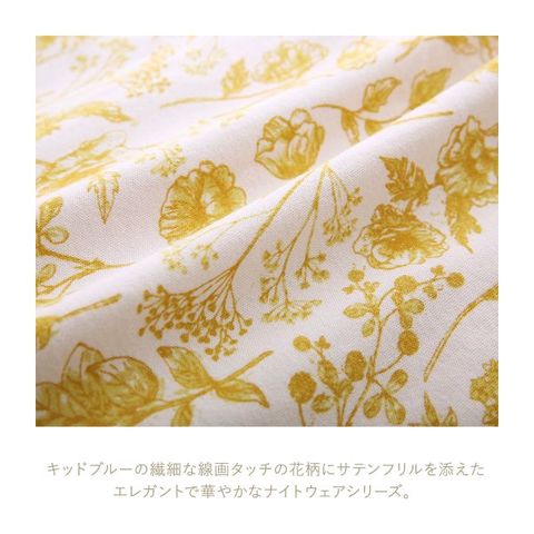 キッドブルーの繊細な線画タッチの花柄にサテンフリルを添えた、エレガントで華やかなナイトウェアシリーズ。