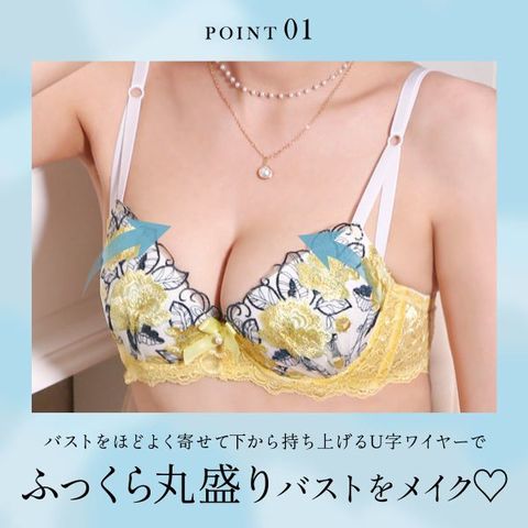 ブラは丸みのきれいなもっちり下厚の内蔵モールドカップ仕様。バストをほどよく寄せて下から持ち上げるU字ワイヤーが、バストトップの位置を高くキープし、デコルテにふっくら感のある丸盛りバストをメイクします。
